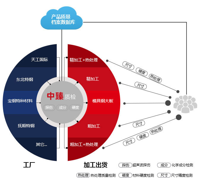 品質(zhì)管控體系總結(jié)概括是“一證,三重,五檢,大數(shù)據(jù)”,它是山東中臻18年經(jīng)驗(yàn)的結(jié)晶。所謂“一證”是指中臻每一種牌號(hào)的每一批貨都會(huì)要求廠家提供品質(zhì)保證書;“三重”是指中臻從進(jìn)貨到加工到出貨,會(huì)進(jìn)行三重品質(zhì)檢測,保證最優(yōu)品質(zhì)的材料送達(dá)用戶手中;“五檢”是指品質(zhì)檢測中五項(xiàng)內(nèi)容,分別是超聲波探傷檢測,化學(xué)成分檢測,預(yù)硬料硬度檢測,熱處理質(zhì)量檢測和尺寸精度檢測;“大數(shù)據(jù)”是中臻的產(chǎn)品質(zhì)量檔案數(shù)據(jù)庫,它集合了原材料從工廠到中臻再到用戶全過程中的品質(zhì)反饋信息,并通過大數(shù)據(jù)系統(tǒng)整合分析,再反饋生產(chǎn)線改善,并不斷的循環(huán)改善。