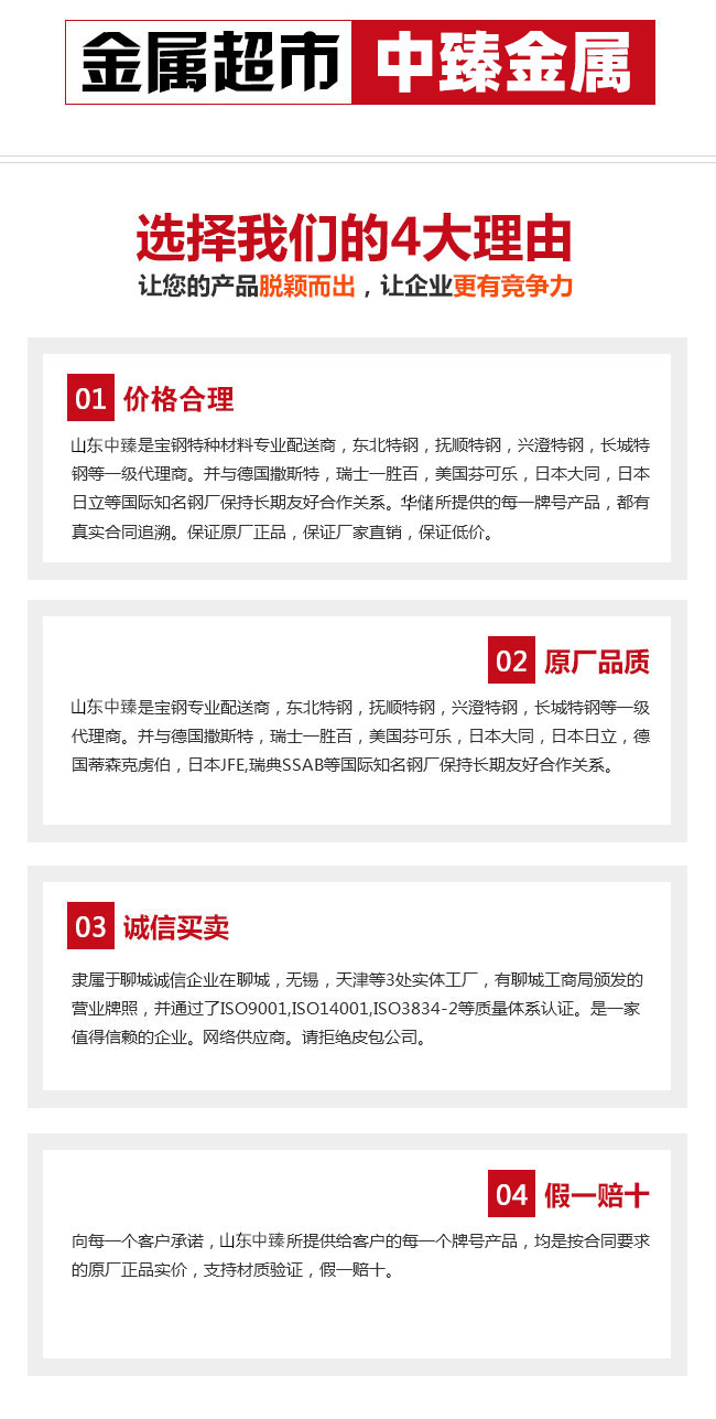 山東中臻是“優(yōu)質(zhì)鋼材一站式供應(yīng)商”,山鋼集團(tuán),東北特鋼,撫順特鋼,長城特鋼,大冶特鋼等一級銷售商。中臻擁有聊城,無錫,天津三處實體工廠,常規(guī)備貨量達(dá)萬噸,規(guī)格齊全,每一所供牌號均有真實合同追溯。